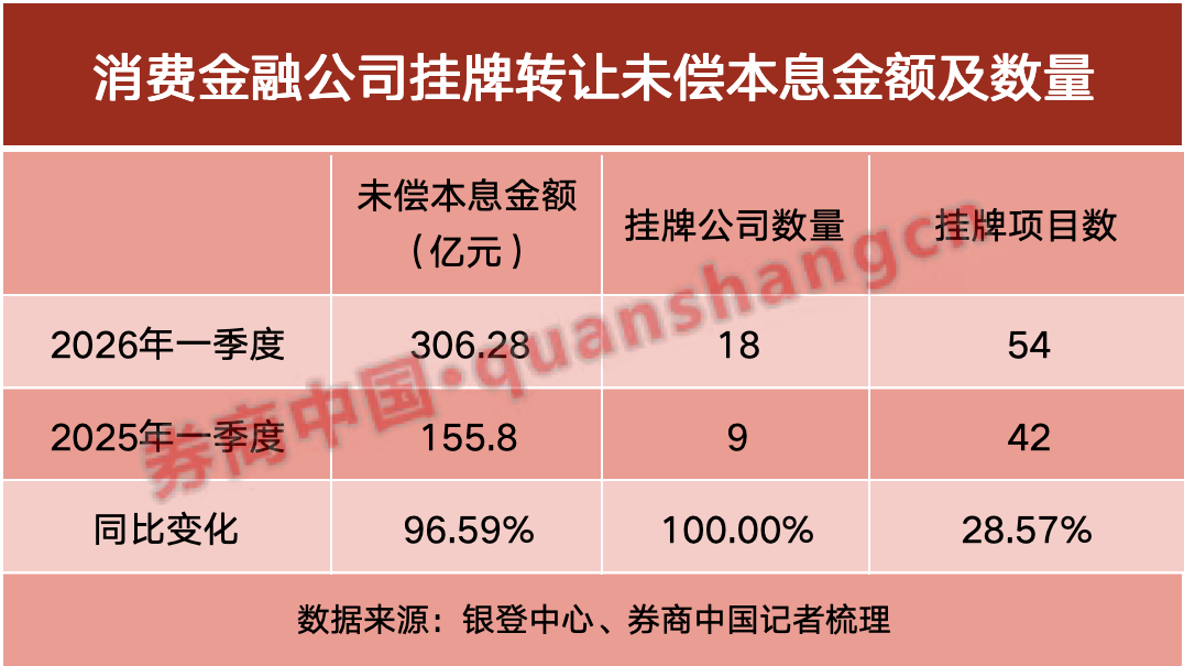 券商中国记者梳理银登中心披露的最新数据,2026年以来消金行业的不良资产出清呈现“量价齐升”的显著特征。2026年以来,已有20家消金公司至少挂牌73个不良资产包,合计未偿本息金额多达393.08亿元。仅今年一季度,参与转让的消金公司数量就同比增长一倍,合计挂牌未偿本息多达306.28亿元,同比增长96.6%。